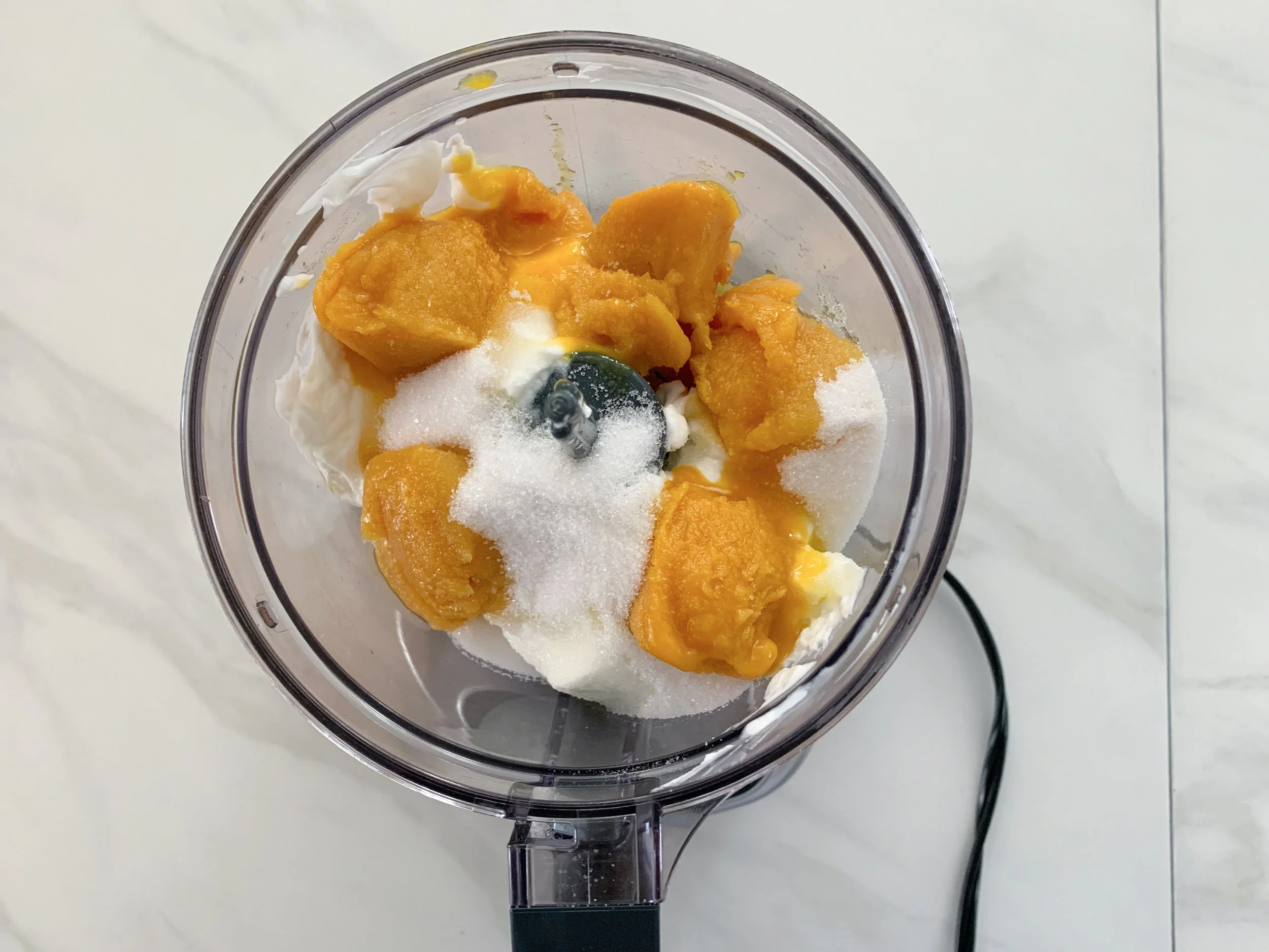Blend the orange juice concentrate ice cubes, Greek yogurt and sugar for 10 seconds